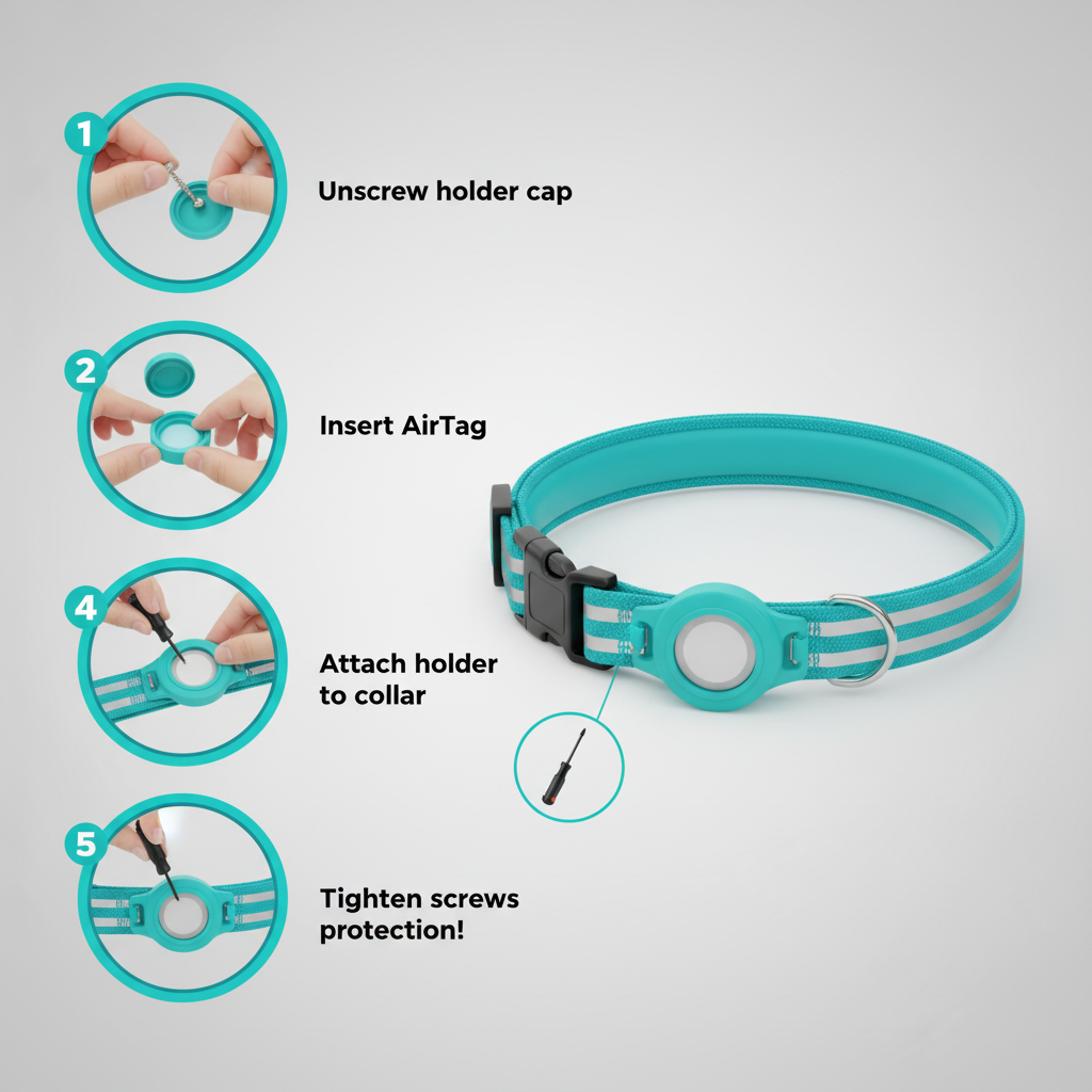 Discover the ultimate blend of safety and style with our heavy-duty dog collar, designed with an adjustable AirTag holder for peace of mind while walking your furry friend.